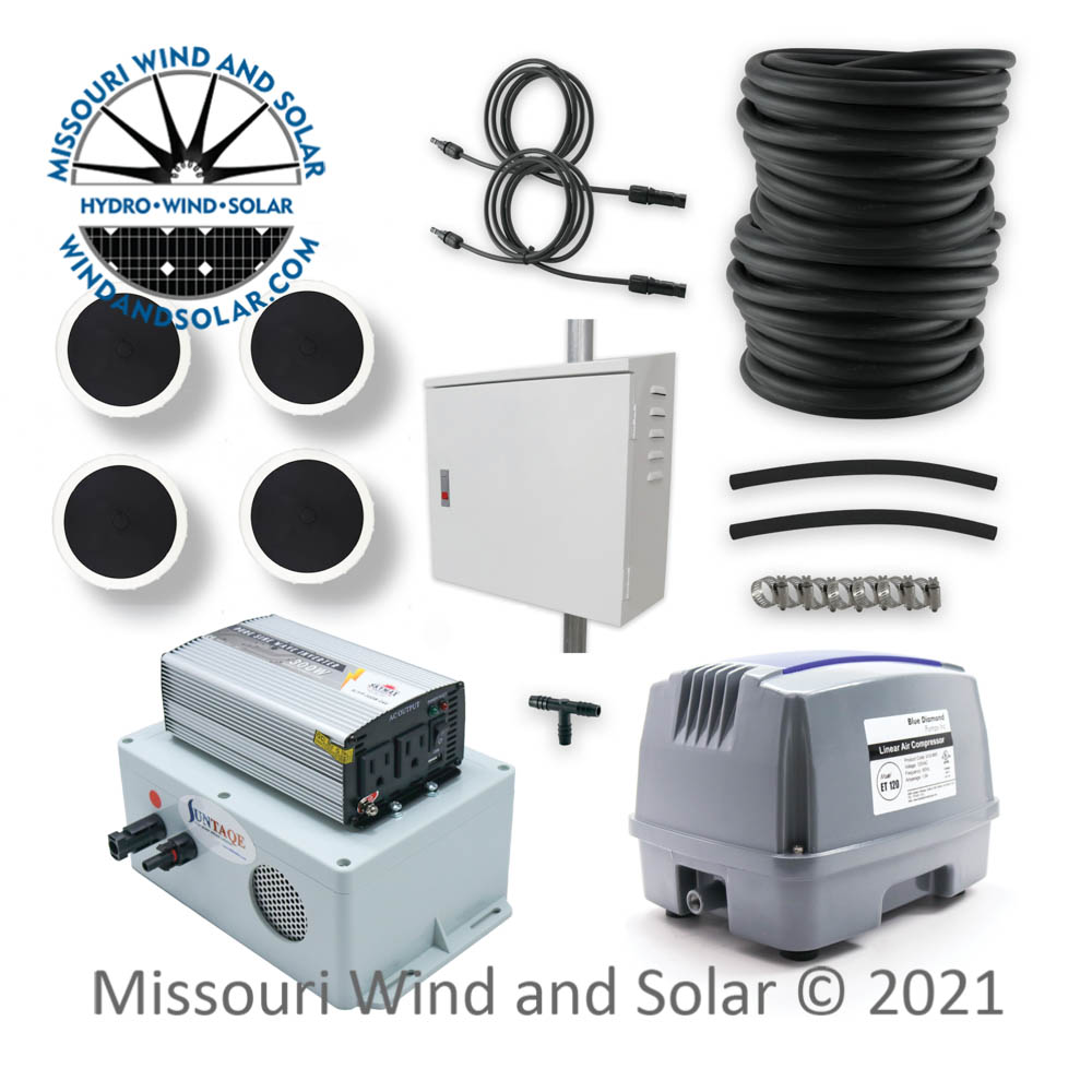 120 Liter Pond aeration kit with side of pole vented water resistant steel pond box and Suntaqe Inverter Controller. This kit is ideal for large sized ponds, 1/2 acre up to 10 feet in depth.
