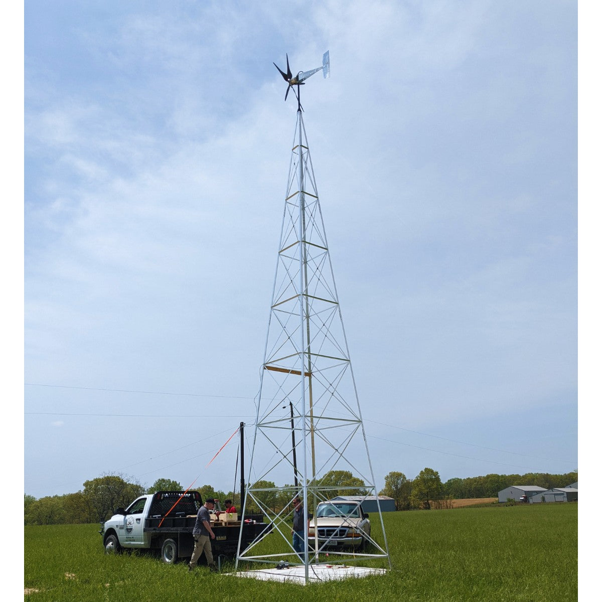 Our wind turbine tower is made with 3/16 inch thick aluminum with hinged feet for raising and lowering. The overall tower height (to top of mast) is 44.5 feet. Tested at our own facility - extremely durable and quiet.